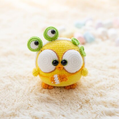 Materials Needed: Yarn A (1 ball) --- Edelweiss yarn #2, yellow#30 Yarn B (10 grams) --- Edelweiss yarn #2, white #01 Yarn C (5 grams) --- Edelweiss yarn #2, orange #32 Yarn D (5 grams) --- 4-ply milk cotton, mustard green #25 Yarn E (1 meter) --- 4-ply milk cotton, yellowish brown #30 Toy stuffing (50 grams) Scissors Yarn needle Stitch marker Alcohol glue 2.0 mm crochet hook Two 12mm eyes with green edges Four 8mm black flat eyes