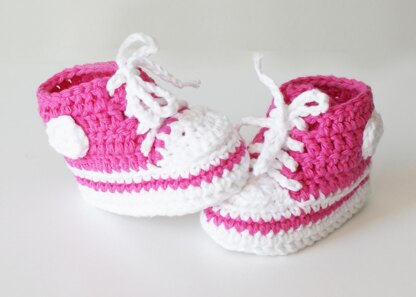 Make your own Baby High-Tops or Sneaker Booties with this crochet pattern. This pattern includes complete instructions for two styles, in two sizes, of unisex sneaker slippers for babies and toddlers; Baby (4" foot length, approximately 6-12 months); Toddler (5" foot length, approximately 1-3 years). With lots of pictures and instructions included with the pattern, this is an easy to follow how-to.