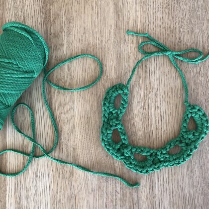 This is a super quick and pretty necklace made using Paintbox Yarns Recycled Big Cotton. You could use a range or different yarns for this project. I’ve also made a multi-strand version using 3 different shades of Paintbox cotton aran held together. The necklace ties at the back and there are no ends to sew in! Just make, wear and enjoy