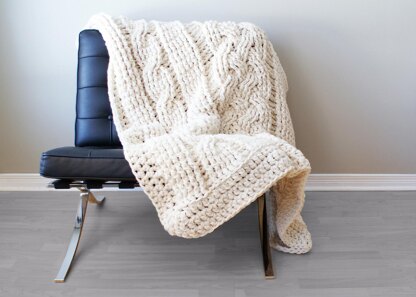 This 45” x 60” (approx.) Super Chunky Double Cable Throw Blanket / Rug is crocheted using 4 strands of acrylic yarn held together as one to create a modern over-sized blanket or rug. With lots of pictures, charts and instructions included with the pattern, this is an easy to follow how-to.