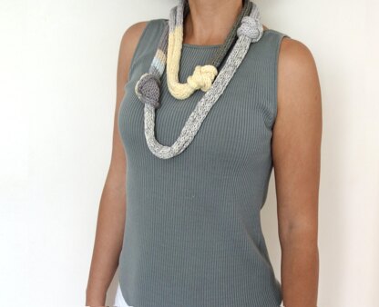 Unique designs for unique women! This modern chunky necklace is a stylish option to complete your outfit. Non-allergenic necklace, crochet with natural fibres. Easy and quick project, perfect for a beginner, the pattern is designed in a simple stitch using mixed yarns to mingle your favourite scrap yarns.