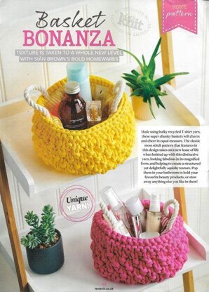 This is a pattern for a chunky basket, shown in two colours. It has a stocking stitch base and double moss stitch side, quick to knit in a super chunky recycled tee shirt yarn. The baskets are lined and have rope handles. This would be fine for a beginner. Photos Lets Knit.