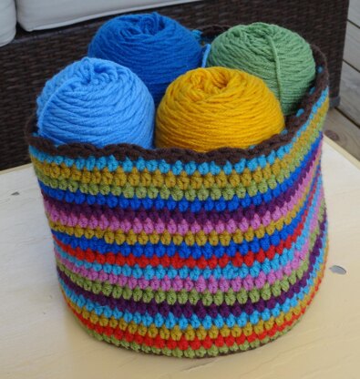Here is a pattern for an eye-catching striped basket crocheted in bright and colorful shades of a chunky wool blend yarn, with crocheted flower appliqués (optional) and wood bead accents (optional). It's a nice, roomy basket which is ideal for holding yarn skeins, fabric, or children’s toys, or it can be used it as a decorative cover for a planter, trash basket or other container. I use a similar basket to hold yarn and rolls of fabric and it really looks pretty in my crafting room. It's fun to make and useful! The yarn I used as pictured is no longer available and neither is the substitute suggested in the pattern. The colors and guage of yarn listed here is a nearly PERFECT MATCH for the original.