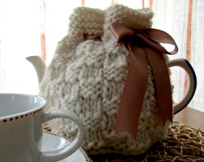 This is a pattern for a chunky textured squares tea cosy. It is quick to knit, and would be a good project for beginners in a simple knit and purl pattern. It measures 22 xm wide x 15 cm to the eyelets. It is tied with a ribbon.
