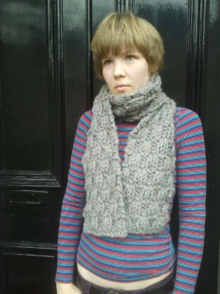 This chunky scarf is knitted in a basketweave pattern, and can be made in two different widths. Adjusting the length is easily done by adding more pattern repeats, and the woven effect is unisex. The scarf will knit up in a couple of hours, making it perfect for last minute gifts.