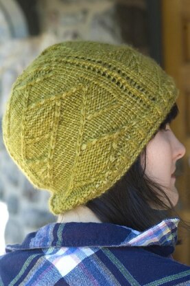 Twists are magical things! They’re like cables, but less fiddly. Here, they’re used to “draw" a series of criss- crossing ribbony things, separated by eyelet ladders. The chart is very intuitive, making it much easier than it looks, and the glittery cashmere yarn can only be described as “really friggin’ luxurious." The combination is sophisticated but light-hearted, and the hat knits up more quickly than you’d expect – perfect when you need a gift that will really wow ‘em or just a special treat for your fine self.
