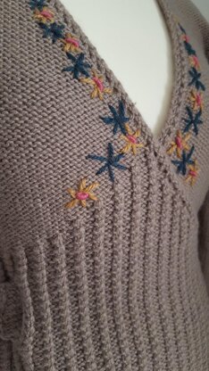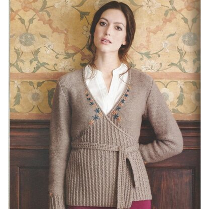 This wrap cardigan was inspired by the style of the 1920s. The upper body and sleeves are knitted in reverse stocking stitch, while the lower body uses a knotted rib pattern, which emphasises the shaping of the garment; simple embroidery adds a pretty finishing touch. The project is knitted in Erika Knight’s British Blue 100 yarn, which is a lustrous Bluefaced Leicester wool grown and spun in Britain.
