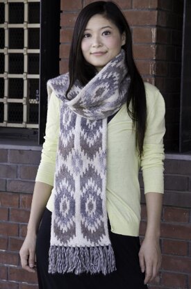 Cilou is a bulky and lush scarf knit in the beautiful shades of Cascade Yarns Eco Duo. The color pattern on the scarf was inspired by the slightly blurry the patterns created when the warp of an Ikat fabric is tied onto a loom.