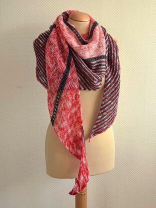 Gauge is not critical in this design, but should be on the loose side. For the sample shawl measured after blocking: 16 sts / 34 rows = 10 cm (4 inch) in garter stitch.
