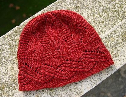 The rich detail and color of carved cinnabar were the inspiration for this hat (for the coordinating scarf, see the [December 2006 issue of MagKnits][2]), which showcases a modified version of the “Double Ribbed Mock Cable” (DRMC) from Barbara Walker’s 4th Treasury of Knitting Patterns. In the pictured hat, the stitch pattern is used both horizontally, for a wide band which wraps around the head, and vertically, from band to crown, but directions are also included for a hat without the horizontal band, which omits the somewhat time-consuming step of picking up stitches along the band.