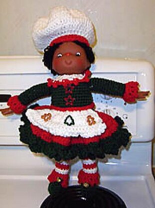 Cinnamon Suzie requires worsted weight yarn, stuffing, and 4 1/2" doll head/hands set. Some small trims for buttons--or embroider 'buttons' instead.