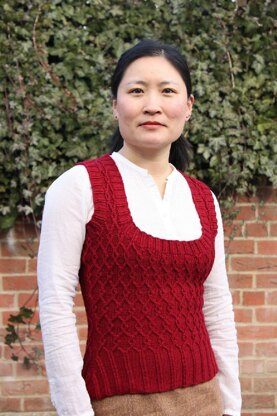 Designed to be be worn over a shirt or blouse, this vest is office-friendly and will perk up any outfit. The deep scoop neck is flattering on most bodies, and the wide ribbing and fitted waist ensure that your shape won't be lost. It's designed to be worn with close to zero ease, so knit the size closest to your measurements. The vest is knit in the round up to the underarm and scoop neck, The cables are knit with twisted stitches, and flow smoothly from the wide band of twisted ribbing at the waist. There are more bust increases on the front of the vest than the back, to accommodate your shape better.