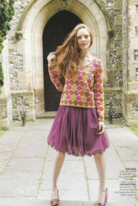 This is a pattern for Circles Intarsia, first designed for Knitting magazine. It has slightly out of shape circles giving the impression of being squashed together, in lovely rich colours on a stone base. Main photos Knitting magazine.