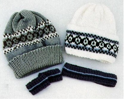 Hat has 2 different styles of cuffs for bottom of hat. There is also a wristband to keep you warm where your short gloves stop. And a matching headband too. These are knit with worsted weight yarns, knitting needles, US# 7. Use up scrap yarn for the easy graph!