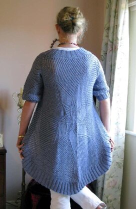 This garment is based on a circular shawl starting at the centre of the motif and growing outwards. To create a better fit the armholes are made when the measurements between to 'points' of the star are the required shoulder width. The side and lower parts of the garment continue to grow as short rows are worked to being the top section of stitches back into work.