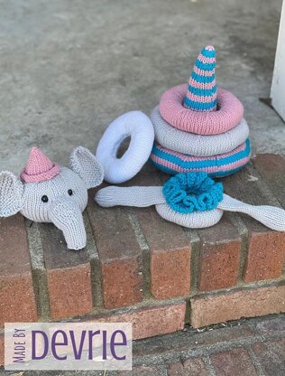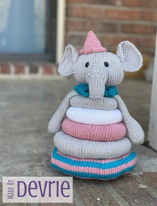 This adorable knitted stackable ring toy is the perfect gift for any new mom or child in your life. Isn't it the cutest little circus elephant you have ever seen? Made with cotton yarn, it is easy to clean and manage. It will provide your child hours of fun. This toy is made by knitting in the round using US size 5 needles. It will stand about 12 inches tall and is about 8 inches wide. It leans more toward advanced on the skill level but would be a nice challenge for an intermediate knitter.
