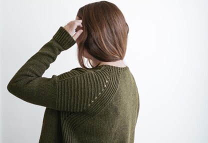 Citrine is a perfect wear-everywhere pullover, with a relaxed, drop-shouldered silhouette, close-fitting long sleeves, and slightly scooped neckline. The body features a clever, faux-raglan detail of traveling twisted ribbing and eyelets, and an exposed three needle bind-off at the shoulder seams.