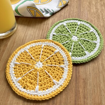 Fun crochet pattern for citrus slice coasters.
