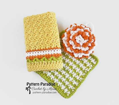 This set includes a dish towel with a pretty edge, crocheted in a dense, absorbent stitch combination, with a pretty edge to keep your kitchen decor stylish. The small dish pad is great for washing dishes or to wipe off counters and appliances. And for tougher dish duty, use the scrubby. The loops provide extra abrasion to scrub off food particles. These are environmentally friendly too, just throw in the wash and re-use!