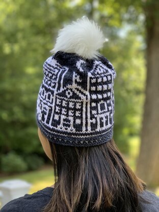 I love the bustle, the noise, the smells and sounds. Growing up I lived near a shipyard and directly under a flight path to Logan Airport in Boston. I woke in the morning to the 7 a.m. shipyard shift-start horn and knew it was time to get up for school. When I first moved to a small town it was so quiet at night, I couldn’t sleep. This hat has the tall buildings, a fire truck, Lola’s Restaurant, a bridge in the distance and lots of windows that hide lots of city stories. Leave out the moon and stars and it becomes a City Day hat. Hat as shown has moon but no stars.