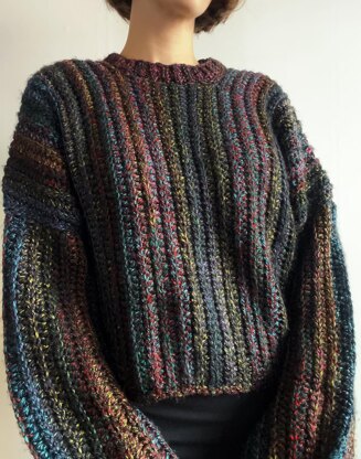 The City Stroll Sweater is an oversized sweater with a boxy fit and knit-like stitches. Although it’s made with chunky yarn, it has an incredible drape.
