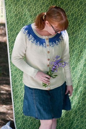 Cityscape juxtaposes traditional circular yoke shaping with an unexpected motif. A city skyline sits around the upper yoke, worked stranded-style in two colours. To make the colourwork easier to knit, the cardigan is knit seamlessly in the round and steeked open at the front.