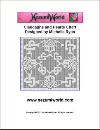 Claddaghs and Hearts filet crochet chart (with first row is written for both a 1 x 1 & 1 x 2 grid). The claddaghs are combined with pretty knotwork hearts Additional information sizes using different yarns is also included. i.e. Using Crochet Cotton Thread size 10: approx. width = 19.1 inches, height = 20.8 inches, Using Worsted Weight Yarn: approx. width = 74.7 inches, height = 76.4 inches. Uses American crochet terms. A Claddagh ring is a traditional Irish ring representing love, loyalty, and friendship - the hands represent friendship, the heart represents love, and the crown represents loyalty. This is perfect for a wedding hanging, tablecloth, throw or blanklet. (depending on yarn/ thread used)