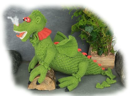 **CLARENCE THE DRAGON toy knitting pattern by GEORGINA MANVELL CLARENCE measures 24 cm high and 44 cm long when completed in DK yarn. He has large clawed feet, a beautiful fanned collar and an arrow tail. He has a superb bobbly coat and ribbed wings. He even has smoke coming out of his nostrils! In the depths of his dark cave Clarence daydreams of the mighty Welsh Kings of Aberffraw who in the 5th century loved dragons. We hope you will love him too. He is easy to knit with very clear instructions to follow. He would make a lovely new addition to your family. This lovely pattern was designed by Georgina Manvell and Suzannah Holwell. **