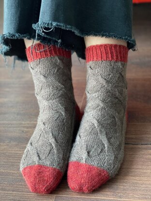 This cable pattern was love at first sight. I knew right away I wanted to use it for a sock design. It was fun challenge to make the cables work in multiple sizes, and I hope you’ll agree that the end result is well worth it! Due to the cable pattern’s inflexible nature, it is very important to choose a size based on actual foot circumference with zero, or even a little positive ease! Enjoy!