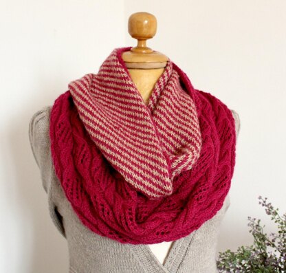 Classic Jazz scarf combines cables and lace to create an intrinsic shape and diagional stripes in two colors using easy fair isle. Wrap yourself on a beautiful jazzy design, super chic and elegant!