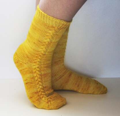 The Classic Plaits socks features a simple, classic braid. They are worked toe-up, featuring a simple braided cable along the outer side of the sock. Instructions include a short row heel and an afterthought heel, for you to choose. The pattern is written so it can be worked using the magic loop method, and would work very well for two-at-a-time.
