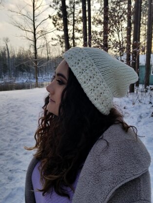 This pattern is for a beanie/slouchy hat knit in a classic rib with a new twist ~ a lace cuff. The lace pattern is very simple. Hat has been designed to fit the average-sized woman's/teen's head circumference. It is very stretchy. I used worsted weight yarn. Any worsted weight yarn should work that will give good stitch definition to the lace pattern. This was a one-skein yarn project in the yarn that I chose. Fun project for fall/winter! The yarn that I chose is eco-friendly!
