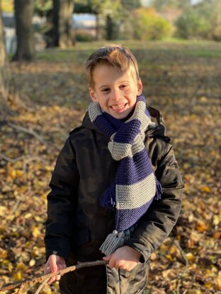 - The scarf pictured uses Plymouth Yarn Worsted Merino Superwash in Light Grey and Navy Tassel maker - optional