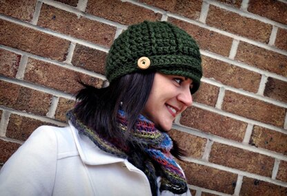 This pattern gives instructions for a brimmed newsboy cap with trim, optional wooden buttons, and additional detailed photo instructions on how to FPDC.