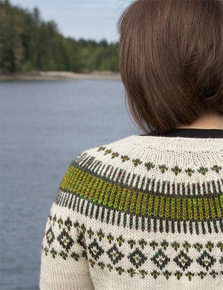 The samples were knit in Sweet Fiber Yarns Merino Twist DK, shades Winter, Moss, Marshland, Paper Birch, and Something Blue. A substitute yarn is shown below.
