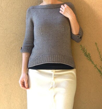 Clear Lines is a boat neck pullover, seamlessly worked in the round, from the top down.The pattern features a very easy textured stitch, A-shaping, underbust darts, buttoned elbow sleeves and curved bottom shorter on the front.This pullover is intended to be worn with a little negative ease at the chest.Sample shown in size 30.5 inches/ 77 cm worn with 1.5 inches/4 cm of negative ease.