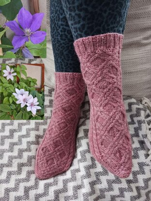 The Clematis Socks are worked from the cuff down with a heel flap. The heel flap is knitted with a reinforced stitch pattern for more durability and stability and it has a special pattern with purl and slip stitches. The gusset decreases are cleverly hidden on the sole so that the elegant cable pattern is not affected. This sophisticated cable pattern runs throughout the sock.