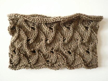 This cowl is knit in a round using lace pattern all the way through. Depending on the softness of the yarn it might benefit from lining to prevent rolling.