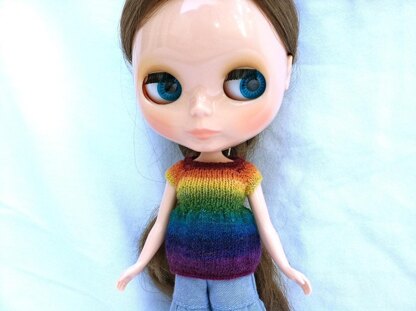 Here’s a lovely top-down, one-piece raglan shirt for Blythe. The torso (with short sleeves) is knitted back and forth, flat, and the skirt is done in-the-round. There are no seams (yay)!