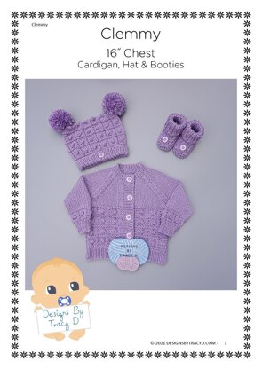 Clemmy is a Baby Knitting Pattern for a cardigan, a square hat and booties to fit a baby 16'' chest (finished size)using DK yarn with 3.25mm & 4mm needles. You will need 200g of DK yarn to make the whole set.