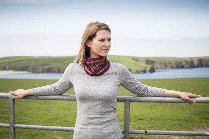 The 2018 Lerwick Up Helly Aa in Shetland was a special year for our family with my first cousin’s husband in the role of lead Viking, the Guizer Jarl. My cousin asked me to design and knit hats and cowls for a few wives and girlfriends of the Jarl’s squad. This cowl, with its motif inspired by the squad’s unique outfit, evolved from those commissions. I love blending colours in corrugated rib and challenged myself to use purple as I rarely knit with it. Combined with other jewel tones it creates a vibrant, warm, and uplifting effect. This cowl is knit in the round with no more than 2 colours in each row. It has a folded picot hem with corrugated rib above and below a Fair Isle motif. Techniques used are knitting in the round, colourwork and corrugated ribbing. The only rows where I have ‘caught a float’ are rows 3 and 13 of chart B where there is a stretch of 7 background stitches together making it an easier fair isle knit.