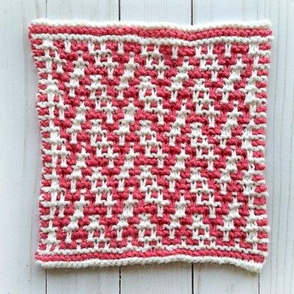 Feathers stack on top of each other, interwoven with a bit of detail to every other row, for a striking and simple kitchen accent. This dishcloth is worked in mosaic pattern, where each row is worked with only one colour, using slip stitches to create a design.