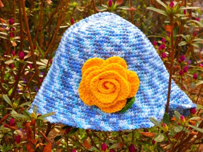 Clio Bucket Hat is worked in spiral rounds and has 3 sections :Crown , Middle Section and a wide Brim that can be worn rolled up or down as you like it. You can embellish your hat with a rose with leaves,