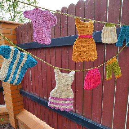 Give your party bunting a humorous, homely feel with set of clothes that captures the everyday joy of freshly dried laundry. Make this colorful garland and decorate your kid’s room, laundry room, garden or any place at home. Easy to follow crochet pattern to make this beautiful decorative bunting, featuring skirt, T-shirt, dress and trousers. The patterns use single crochet stitch throughout (US terms).