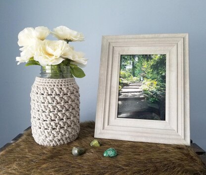 This pattern is a cozy designed for mason jars. It includes a pattern for the pint size and the quart size. The pint size uses about 45 yds of the Bernat Maker Home Dec or Fashion yarn and the quart size uses 77 yds. I would say this pattern is an advanced beginner level as it features a new stitch I created and named the Bolster Stitch.