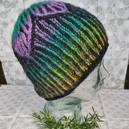 Working in brioche always makes me think of baking bread. A traditional loaf inspired this hat. A Coburg loaf is slashed across the top before baking which creates coloured star on the top. This hat replicates the effect using syncopated brioche.
