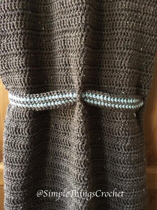 This pattern is great for beginners as it uses only basic stitches. You will be making three rectangles and sewing them together. The length is 34” from top to bottom, the back panel is 22” wide, and the front panels are 10" wide each. The size is easily adjustable by increasing or decreasing the size of your panels. You will need 3 skeins of Caron Simple Soft Tweeds in Taupe, and 1 skein of Caron Simply Soft in Soft Blue. You will only need a very small amount of the Soft Blue as it is only used in the belt. The gauge is 16 dc stitches and 8 dc rows = 5”