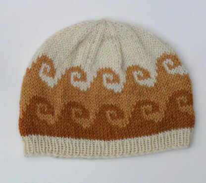 The colorwork pattern is inspired by the swirling shapes made by cream as it is added to a hot cup of fragrant coffee. The white crown of the hat represents the cream; the light and dark brown swirls are the coffee as it mixes with the cream; and the white ribbing at the bottom of the hat represents the thick-walled white ceramic mug holding the coffee.