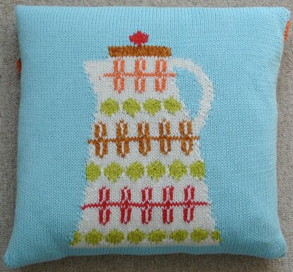 A cushion cover to fit a 40 cm x 40 cm cushion pad, with a retro coffee pot motif on the front, and stripes on the back. 5 x medium buttons are needed. The yarn used is a cotton DK from Yeoman Yarns, but this can be substituted by other DK yarns. The 4 ply chenille is used double. The cotton DK comes on cones, so the equivalent in 50 gm balls have been used for the yarn amounts.