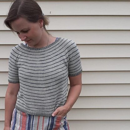 It’s worked seamless topdown, starting with decent increase lines around the circular yoke, at underarm you devide into body and sleeves and finish them separately. Cuffs, hem and neck are worked in a small striped half twisted rib.